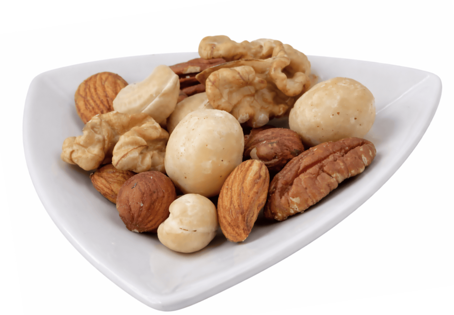 Edle Nussmischung aus 6 Nuss-Sorten: Cashewkerne, Haselnusskerne, Macadamianusskerne, Mandeln, Pekannusskerne und Walnusskerne.