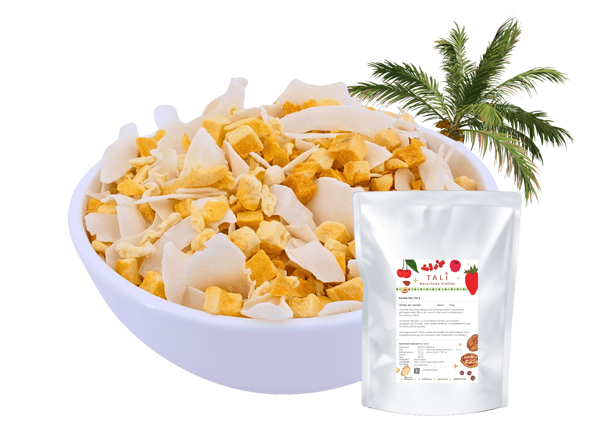 Unser Karibik-Mix besteht aus Kokoschips, gefriergetrockneten Mangostücken, gefriergetrockneten Ananasstücken und Maracuja-Crunchies (Maracuja-Fruchtkonzentrat, Glucosesirup, Pektin). Er ist nicht nur wohlschmeckend, sondern liefert darüber hinaus eine Reihe an wertvollen Nährstoffen!