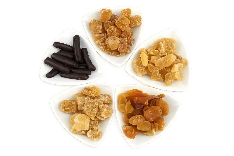 Kandierten Ingwer mit Fruchtzucker kaufen – natürlich süß & würzig Diese Variante unseres kandierten Ingwers wird ausschließlich mit Fruchtzucker veredelt – für eine besonders natürliche Süße ohne Kristallzucker. Die feine Ingwerschärfe bleibt erhalten und harmoniert perfekt mit der milden Süße der Fruktose. Ideal für alle, die bewusst genießen möchten – als Snack, in der Küche oder zum Verfeinern von Getränken. Jetzt online bestellen bei TALI! Verwendung und Verarbeitung von kandiertem Ingwer mit FruchtzuckerGetrockneter kandierter Ingwer mit Fructose eignet sich hervorragend als natürlicher Snack für zwischendurch – ganz ohne raffinierten Zucker. Seine sehr dezente Süße macht ihn besonders attraktiv für alle, die auf künstlichen Kristallzucker verzichten möchten. In feine Streifen geschnitten oder gehackt, lässt sich dieser Ingwer ideal in Müslis, Porridge oder Energy Balls integrieren. Auch in Teemischungen oder Gebäck sorgt er für eine aromatische Würze – und das ganz ohne künstliche Zusätze.Suchen Sie nach Inspirationen, wie Sie kandierten Ingwer in der Küche verwenden können? Gerne teilen wir mit Ihnen ein paar Ideen: Ingwerplätzchen: Knusprige Kekse mit fein gehacktem kandierten Ingwer – ideal zur Weihnachtszeit. Ingwerwasser: Kandierten Ingwer in Scheiben schneiden und gemeinsam mit Zitronenscheiben in kaltem Wasser ziehen lassen. Einfach zubereitet und sehr erfrischend. Apfelmarmelade mit Ingwer: Verbinden Sie die fruchtige Süße sonnengereifter Äpfel mit der pikanten Schärfe von Ingwer und entfachen Sie ein aromatisches Zusammenspiel, das den Gaumen überrascht und begeistert. Perfekt als Brotaufstrich, zu Käse oder als raffinierte Zutat in Gebäck. Wie wird Ingwer mit Fruchtzucker hergestellt?Im Gegensatz z.B. zu kandiertem Ingwer (Thailand) wird unser Ingwer mit Fruchtzucker nicht in einer konzentrierten Zuckerlösung gekocht. Stattdessen werden die sorgfältig geschälten und zerkleinerten Ingwerstücke mit nur 10 % zusätzlichem Fruchtzucker im eigenen Saft gekocht und im Anschluss getrocknet. Das Ergebnis ist fester, sehr würziger und trockener kandierter Ingwer mit sehr wenig Süße. Aussehen, Geschmack und Aroma von kandiertem Ingwer mit Fruchtzucker Im Vergleich zu regulärem kandiertem Ingwer unterscheidet sich die Variante mit Fruchtzucker deutlich. Bereits auf den ersten Blick fällt die dunklere, an Kandiszucker erinnernde Farbe auf. Auch sind die Ingwerstücke deutlich kompakter und härter. Die Konsistenz ist zäh, was durch spürbare Pflanzenfasern unterstrichen wird. Der zu Beginn recht milde Geschmack braucht etwas Zeit, um sich bemerkbar zu machen. Erst nach einigen Malen kauen spielen die Aromen und die Schärfe ihr volles Potenzial aus. Die faserige Struktur der Ingwerstücke erlaubt einen langen, nachhaltigen Genuss. Neben dem unterschiedlichen Kaugefühl überrascht auch die sehr dezente Süße des Produkts. Einige Kunden haben uns die Rückmeldung gegeben, dass Sie den kandierten Ingwer mit Fructose aus genau diesem Grund bevorzugen und als gesunde Alternative zu Kaugummis verwenden. InhaltsstoffeDieser kandierte Ingwer sticht bei den Zutaten hervor. Er wird fast nur aus Ingwerwurzeln – und nur zu 10 % aus Fruchtzucker hergestellt. Das macht ihn perfekt für Menschen, die bei Ihrer Ernährung auf raffinierten Kristallzucker verzichten möchten. Ingwer enthält natürliche ätherische Öle wie Gingerole und Shogaole, die für seine Schärfe und sein Aroma verantwortlich sind. Neben Kohlenhydraten liefert er geringe Mengen an Magnesium, Kalium und diversen B-Vitaminen. Ingwer: Herkunft und AnbauTropische und subtropische Zonen bieten ideale Voraussetzungen für den Anbau von Ingwer – dort sorgen feuchte Wärme und lockere Böden für optimales Wachstum. Unterschiede in Klima und Bodenbeschaffenheit spiegeln sich deutlich im Geschmack und in der Qualität der Wurzeln wider. Hauptanbauländer sind Indien, Nigeria und China.Unser kandierter Ingwer mit Fruchtzucker stammt aus Thailand – einem Land mit idealen klimatischen Bedingungen für hochwertigen Ingweranbau. Die Botanik von IngwerZingiber officinale, besser bekannt als Ingwer, ist eine krautige Pflanze aus der Familie der Ingwergewächse. Sie zählt zu den ältesten bekannten Kulturpflanzen; bereits seit über 3.000 Jahren wird Ingwer in Südostasien angebaut. Der unterirdische Pflanzenteil, das verzweigte Rhizom, speichert Nährstoffe, ätherische Öle und Scharfstoffe und wird daher als Gewürz oder Heilpflanze verwendet. Die Pflanze selbst bevorzugt feuchtwarme, tropische Klimabedingungen und bildet schlanke, grüne Sprossen mit länglichen Blättern. Die Blüten erscheinen selten, sind aber dekorativ: Sie zeigen ein gelbliches Herz mit purpurfarbenem Saum.Entscheiden Sie sich für einen bewussten Genuss – bestellen Sie kandierten Ingwer mit Fruchtzucker bei TALI! kandierter Ingwer mit Fructose – lieferbar in zwei verschiedenen VerpackungsvariantenKunststoff-Standbodenbeutel Wiederverschließbare, stabile Verpackung Eignet sich zur Lagerung Bis zu 10 Monate MindesthaltbarkeitPapiertüte Nachhaltige Verpackung aus 100 % Papier Ideal, wenn der Inhalt sofort verbraucht oder in eigene Behälter umgefüllt werden soll 1 Monat Mindesthaltbarkeitsdatum – wird durch Umfüllen in geeignete Gefäße verlängert