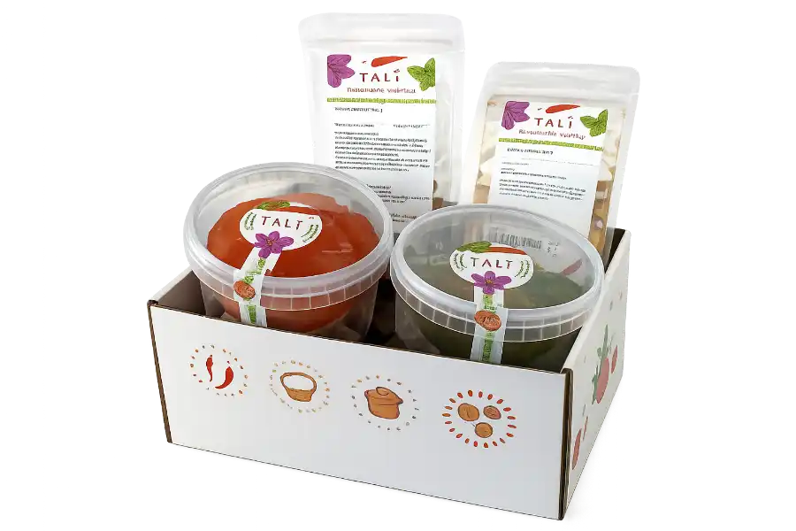 TALI Geschenkbox "Ingwer"Entdecken Sie die Geschmacksunterschiede der aus verschiedenen Anbauländer stammenden Ingwersorten und finden Sie Ihren Lieblings-Ingwer!Inhalt:100 g kandierter Ingwer aus Thailand fruchtig-scharf, ohne Streuzucker100 g kandierter Ingwer aus Fidjimild-aromatisch mit wenig Schärfe, mit Streuzucker umhüllt100 g kandierter Ingwer aus Chinasehr scharf mit fruchtig-zitronigem Aroma100 g kandierter Ingwer mit Fruchtzuckeraromatisch-scharf, durch Kochen im eigenen Saft kandiert100 g Ingwerstäbchen in Zartbitterschokoladearomatischer Ingwer umhüllt von feinherber Zartbitterschokolade