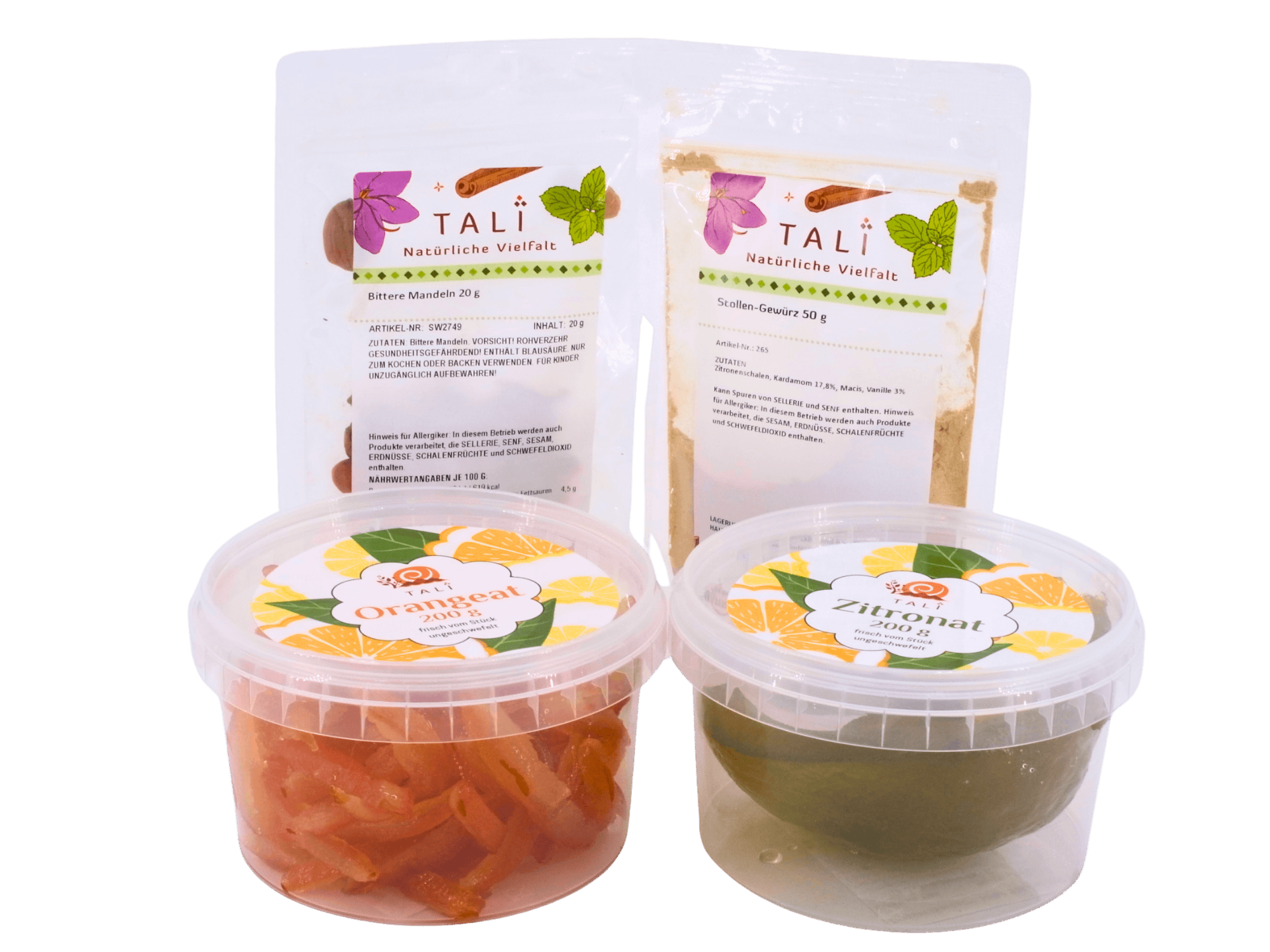 In diesem Backset erhalten Sie alle wichtigen Zutaten für die Stollenbäckerei: Zitronat, Orangeat, Bittere Mandeln und ein weihnachtliches Stollengewürz